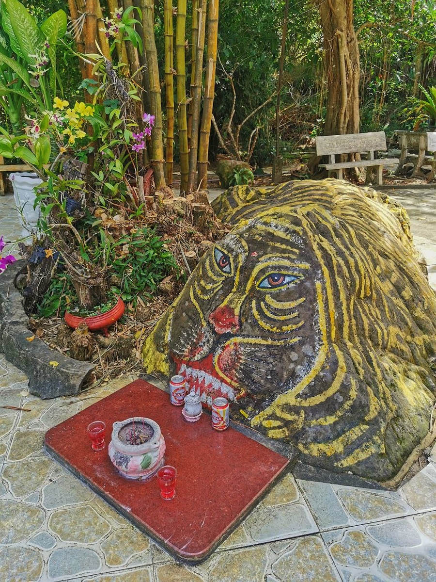 Пагода расположена на вершине холма, примерно в 4 километрах к востоку от города Дуонг Донг, и считается старейшей буддийской святыней на острове Фукуок. Видео с места на ютубе или рутуб Построен храм на пожертвования местного населения и до сих пор часть парка достраивается. Начнём сначала. Дорога к храму в целом неплохая, были замечены небольшие дыры и их было немного, объехать не составит труда. Байк легко поднимается наверх. Запарковаться можно у местного магазинчика с сувенирами, тут же есть бесплатный туалет, а ещё здесь питаются служители храма. Встречает туристов несколько статуй с молитвенней и аутичный тигр, разложившейся под кроном большого старого дерева Кения. На вершине храма вы увидите статуи Будды, с балкона которого можно оценить широкие виды на гору Хэм Нинь и береговую линию вокруг острова Фукуок, окрашенные скальные образования с изображениями различных животных, много зелени и сидячих мест, где можно приземлиться. Это действительно то место, где не нужно б