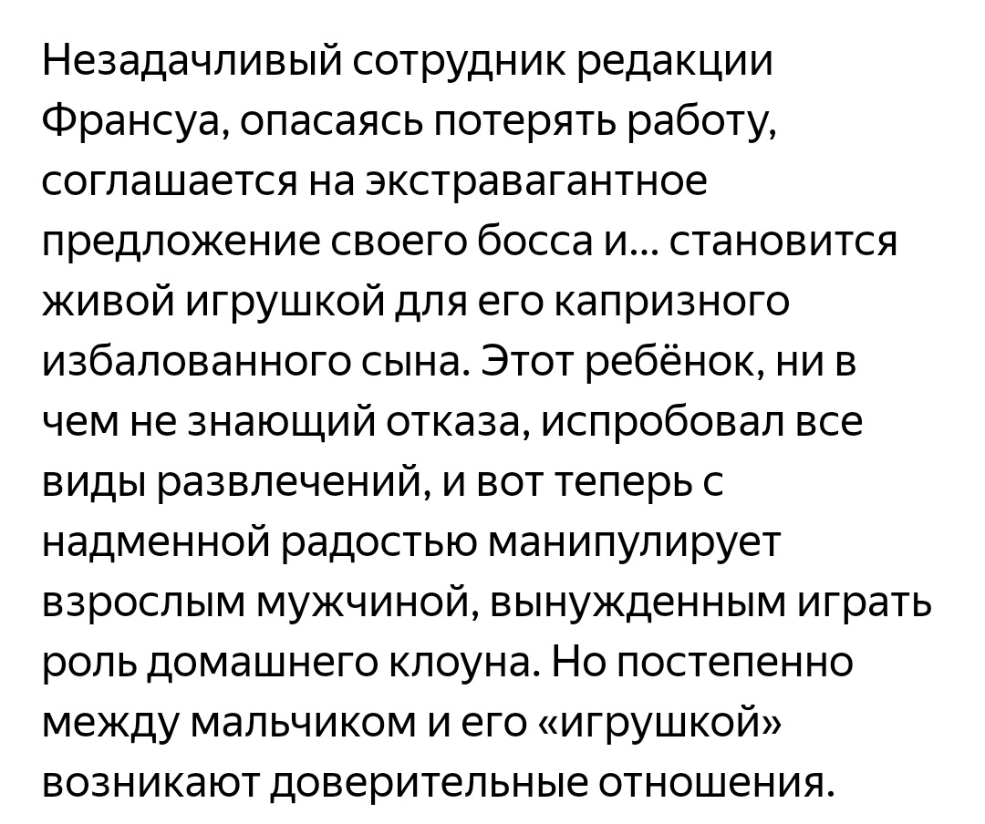 Фильм "Игрушка" (1976) много лет назад я впервые посмотрела этот фильм, в кинотеатре. Помню, как злил меня избалованный мальчишка, и как было жаль Франсуа, героя Пьера Ришара. Я тогда сама была ребенком, и увидела и запомнила именно «поверхностный», событийный сюжет фильма.