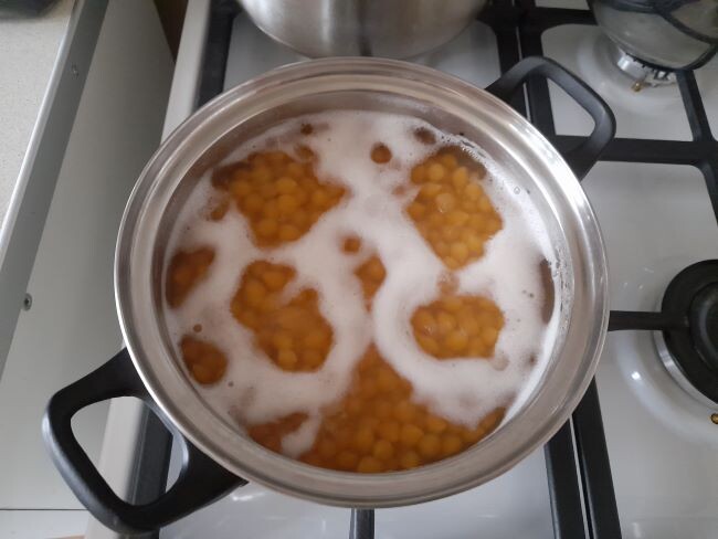 Из турецкого горошка — нута можно легко приготовить хрустящее лакомство. нут — 250 г., оливковое масло — 2 ст. л., паприка — 1 ч. л., чёрный перец молотый — 0,5 ч. л., зира (кумин) — 1 ч. л., куркума — 1 ч. л., соль (по вкусу). Нут замочить в холодной воде на 12 часов, несколько раз менять воду.