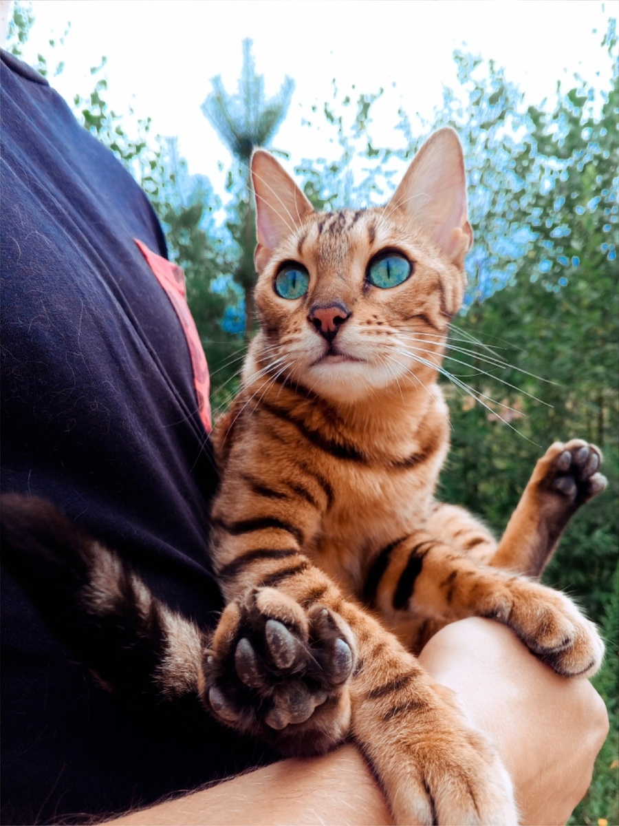 Кто подписан на канал, тот знает, что порода нашей кошечки Белочки — бенгал, а это очень энергичная кошка, и чтобы она посидела на месте, это невозможно. Мы летом часто ходим гулять, так как переехали жить из города в деревню.Выходя из дома мы берем ее на ручки что бы быстро дойти до поля где много места ей побегать. Гуляли мы летом с кошечкой почти каждый день, вот она и привыкла к ручкам. Да и фотографии получаются милые, что тут уж сказать. Всех с наступающими праздниками.