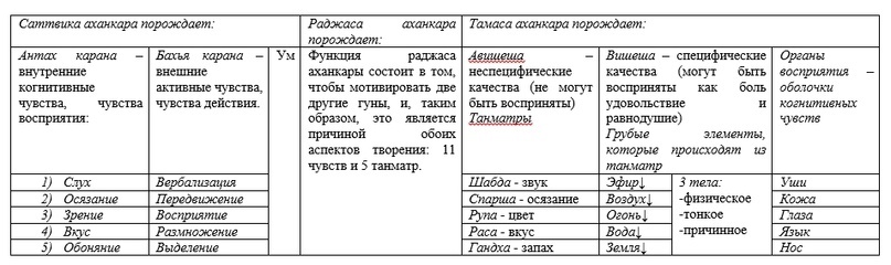 1) махат->2) аханкара->3-13) 11 чувств ->14-18) 5 танматр -> 18-23) 5 грубых элементов