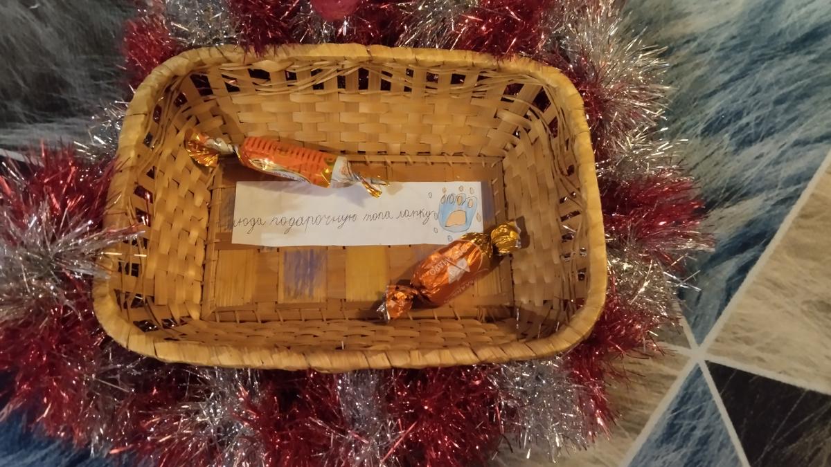 Дочка ещё осенью написала Дедушке Морозу письмо с просьбой подарить ей тополапку. В декабре достала из ниши ёлочку и нарядила её сама. И взяла плетёную корзиночку, это место для подарка и положила записку "сюда подарочную топо лапку".Да, " Дед Мороз" купил эту тополапку, но по не знанию, попалась липкая игрушка, сейчас она висит на потолке.