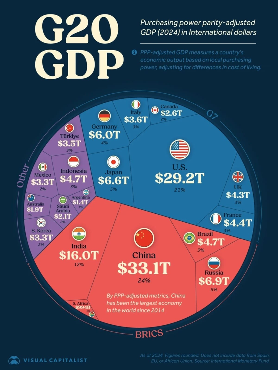 Как вы уже знаете, Россия в этом году официально опередила Японию, став четвёртой экономикой планеты. К посту приложена инфографика от «Наглядного капиталиста» — по всему миру признают наши успехи, как свершившийся факт. Россия в красной зоне справа — 6,9 трлн долларов, 5% от мирового ВВП. Япония в синей зоне слева, чуть меньше.