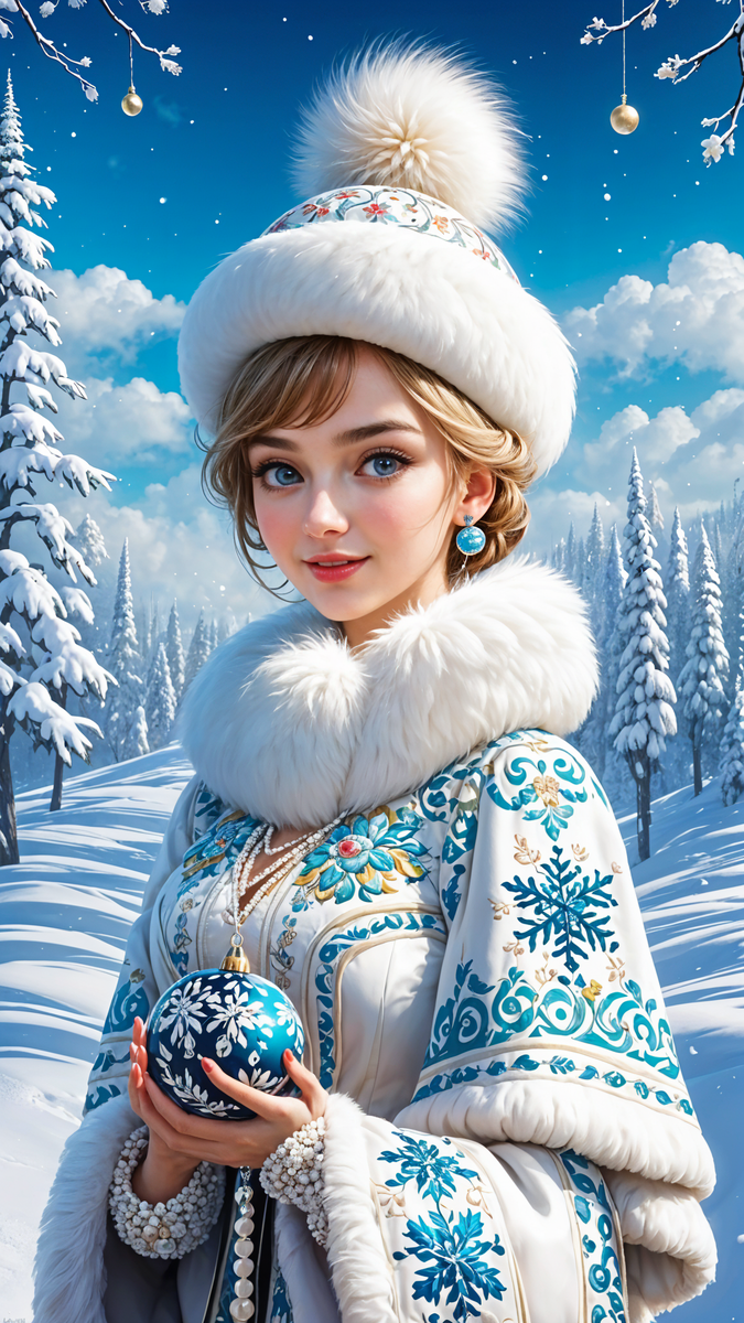 Девушка в традиционном русском наряде держит в руках новогодний шар. Она одета в белую шубу и шапку с узорами, украшенную бисером и бисером. На заднем плане виден зимний пейзаж со снежинками
