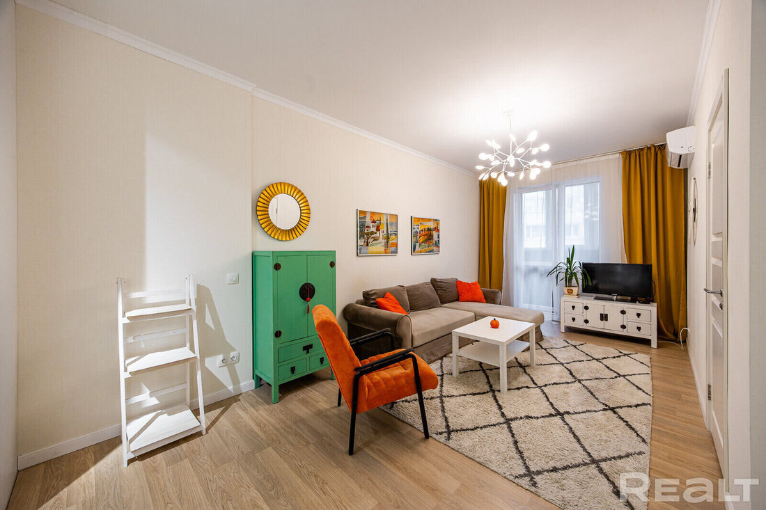 Эта новостройка в обжитой зеленой Золотой Горке привлекает внимание многоэтажностью, яркими вставками и круглыми окнами. Дом построили в 2019 году, а проектировать его начали за 10 лет до этого. Кстати, раньше на этом месте был частный дом с огородом и общежитие хлебозавода. Сейчас в доме на продажу выставили двухкомнатную квартиру со стильным ремонтом. Показываем. Дом по адресу переулок Горный, 8 стоит на возвышенности. Вообще переулок совсем небольшой, это всего несколько зданий. До проспекта Независимости отсюда меньше километра, недалеко и трамвайные пути. Дом находится между станциями метро «Площадь Победы» и «Площадь Якуба Коласа». До каждой из станций чуть больше километра или около 15 минут пешком. До Комаровки — около получаса. В доме 12 этажей и один подъезд. На входе консьерж. Ремонт в подъезде выполнен в темных тонах. Отделочные материалы, входные двери, почтовые ящики — все выдержано в единой стилистике. На полу и стенах уложена итальянская плитка. Прямо у входа большое по