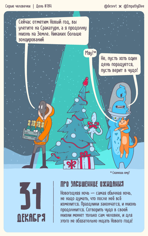 Проект Серые Человечки — совместный ежедневный проект-календарь иллюстратора @desvvt и психолога @empathydive длиной в год, в формате полувредные советы. Текст на комиксе является полезным советом по бытовой психологии, а персонажи в комиксе доводят все до абсурда, устраивают сатиру, перегибают со стереотипами, то есть всячески показывают КАК ДЕЛАТЬ НЕЛЬЗЯ. Все посты можно посмотреть в серии постов.
