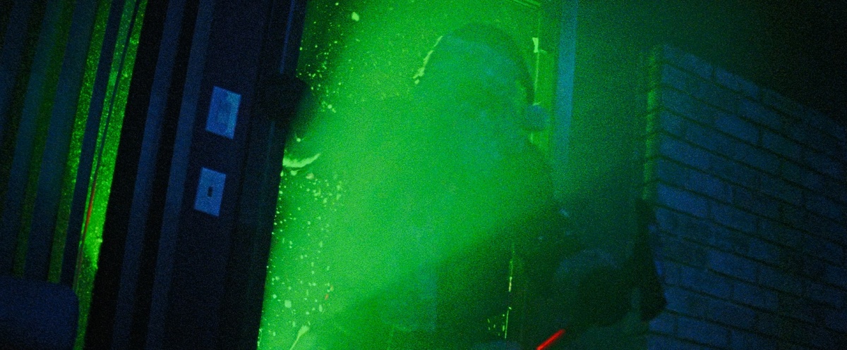 Джо Бегос известен своим пристрастием к аналоговым технологиям съёмки, неону и прочим трюкам с освещением. И тут он разгулялся на полную. Крупное, нагло заявляющее о себе зерно дешёвой 16-мм плёнки переливается в оттенках синего и красного, сплетённых в безумном калейдоскопе. Мерцание света – и есть кино. Свет и зерно. Зерно, зерно, зерно! Оно шуршит, оно укутывает, напоминая о том, какими должны быть фильмы. Всё в этом фильме, начиная от сюжета и заканчивая освещением, больше напоминает рок-концерт, разнузданный, безбашенный, упивающийся собственной арт-природой. «Кровавое Рождество» потому ничего и не пытается объяснять зрителю, потому что искусство не объясняет. Искусство чурается правдоподобия. И Бегос это прекрасно понимает.