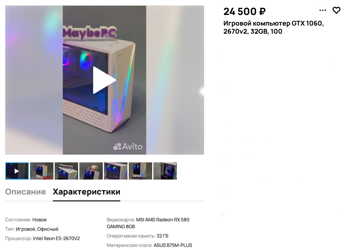 В этой статье, я расскажу, какой ИГРОВОЙ компьютер можно собрать с авито собственными силами в 2025. На авито много готовых сборок компьютеров, но я вам скажу так, во-первых, они сомнительного качества, во-вторых у них наценка около 10+ тысяч рублей, относительно комплектующих по отдельности. В основном у сборщиков тренд продавать компьютеры на зеонах (серверные процессоры интел с алиэкспресса, которые стоят копейки, а по их заявлениям они превосходят i9 9900k АГА) и с видеокартой Nvidia GTX 1660+-. Обычно себестоимость такой сборки около 20 тысяч рублей, а продают их за 30+ тысяч рублей. Ни в коем случае не советую брать готовые сборки пк и уж тем более на ЗЕОНАХ. Вот несколько примеров таких сборок: Во-первых, тут обман в названии. Указана видеокарта gtx 1060, а на деле amd rx 580 вполне вероятно китайская, урезанная. Во-вторых, себестоимость данной сборки, как бы красиво она не выглядела около 16-17 тысяч рублей. В-третьих, производительность оставит желать лучш