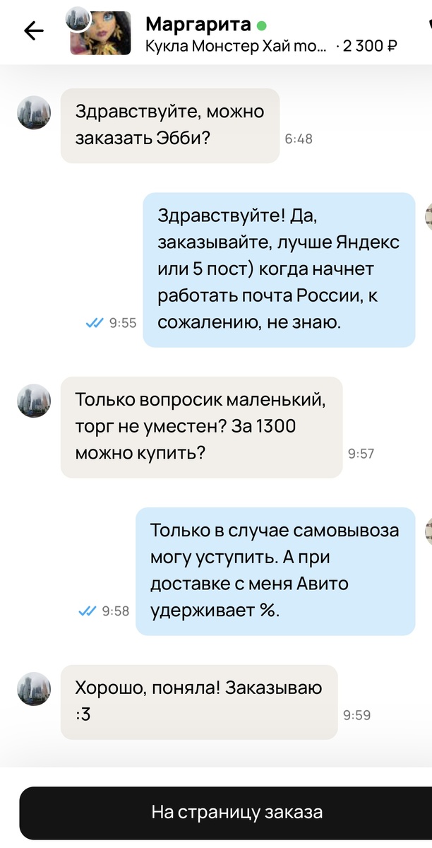 Не верила я, что под конец года случаются неприятные вещи, а зря.. Рано утром 31 декабря пишет мне потенциальная клиентка с уточнением «можно ли оформить заказ» и торгом. На первое я даю согласие, а торг только на моих условиях: самовывоз. Покупательница оформляет заказ на Авито через Яндекс-доставку, - а я как раз собиралась в WB, оба пункта рядом. Упаковала куклу и отнесла в Яндекс. А в начале четвертого мне пришло уведомление об отказе от заказа и его возврате… У меня шок! Я пишу этой Маргарите, а тут выясняется, что «у руля» ребёнок, без денег и мозгов. Ей папа не разрешил купить куклу! А уточнить у него заранее, до того, как оформила заказ? Я не понимаю, как эти дети так спокойно распоряжаются деньгами, которых у них нет! Настроение у меня испорчено! Ориентировочно возврат придет до 14 января. Я, конечно, надеюсь, что раньше! Жаль, что посылка успела покинуть пункт Яндекса и оказалась в сортировочном центре. Напишу подробный негативный отзыв этой девице, что бы больше с ней никто