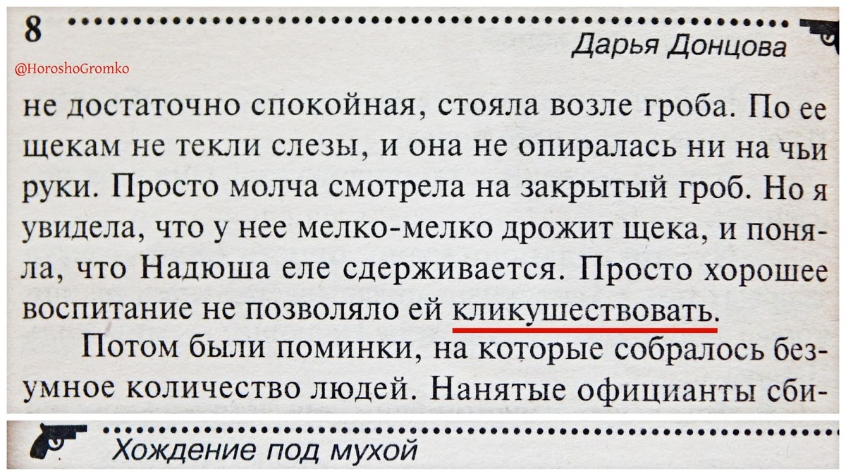 В «Хождении под мухой» Дарьи Донцовой вычитала интересное слово - КЛИКУШЕСТВОВАТЬ. А вы знаете, как я люблю находить в книгах интересные слова, у меня уже целый словарь собрался. «Хождение под мухой» иронический детектив, местами действительно забавный, хотя сюжет мне показался для Донцовой чересчур мрачным. В центре внимания группа преступников, которые убивают людей на органы для трансплантации. Начинается с того, что по трагической случайности погибает молодой, талантливый, всеми уважаемый врач: загорелась машина, он был за рулём, не смог выбраться, в общем, достали одни угольки, хоронили в закрытом гробу. Покойник был женат на женщине по имени Надя, оба они были людьми интеллигентными, прекрасно воспитанными. Надюша даже у гроба любимого мужа стоит с достоинством. Не то что она не испытывает эмоций. Просто хорошее воспитание не позволяет ей кликушествовать. Вот фрагмент ещё раз: Тех, кто кликушествует, называют кликушами. Иначе говоря, кликуши - это люди, подверженные кликушес
