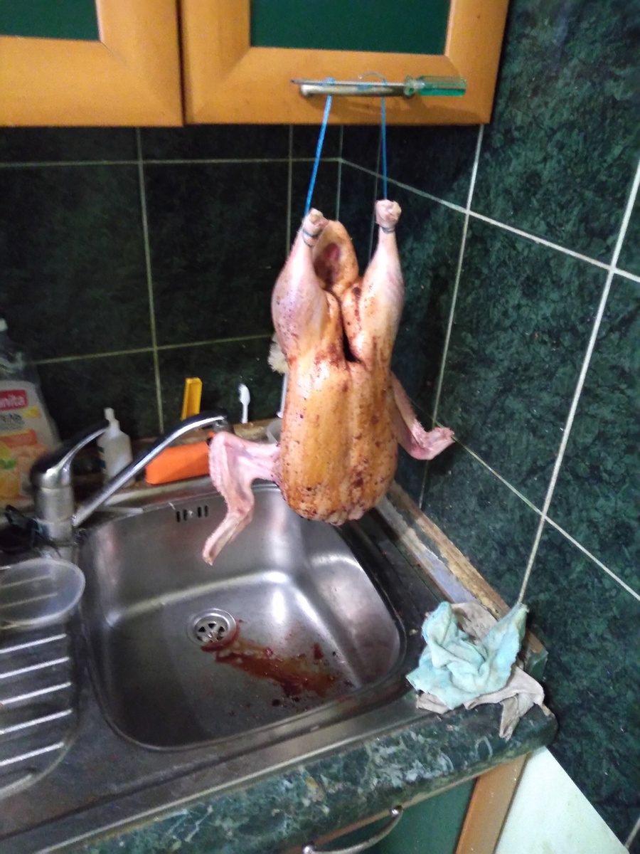 Есть две категории человечества: первые-любят утку и фанатеют от неё, вторые-не воспринимают и не понимают её вкус. Эта статья для первой категории, а вторая-пусть давится слюной:) Почему онлайн? Потому, что если сейчас у вас есть размороженная утка и напольный вентилятор-Вы сможете её приготовить к НГ. Оригинальная утка готовится неделю+-, но! Мы сделаем её адаптацию, лишь немного уступающую оригиналу. 1. Берем размороженную утку и кипятим чайник воды из-под крана. Утку кладем в вымытую раковину и, как чайник(1,5-1,8л) вскипел-обливаем утку по коже с двух сторон по половине чайника. Кипятим ещё чайник и повторяем процедуру. А тем временем готовим "сушку" и шпагат. Сушка-15 гр соли мелкой или в кофемолке пробиваем с сахаром+5-10 гр сахара, немного воды, чтобы смесь намазывалась на кулинарную кисть(или малярную). Шпагат-см фото-для "казни" утки:))) Подвешиваем, обмазываем смесью соли и включаем на максимум напольный вентилятор. На обмазанную сторону высушиваем час. Далее-вторую и час. О