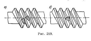 Вероятно, стоило бы дать такое определение: геликоид - поверхность, образованная движением отрезка кривой по спирали с сохранением ориентации относительно сопровождающего трёхгранника. Оставляя на усмотрение профессиональных математиков классификацию поверхностей червяков червячных передач, получающихся при применении металлообрабатывающих инструментов с прямолинейной производящей кромкой, напомним схемы позиционирования инструментов относительно червяка в процессе обработки по Ф.Л.Литвину: Рис. 1 Нетрудно видеть, что получающиеся поверхности витка червяка относятся к одному и тому же типу: меняется только их порядок и параметры. Рис.2. Нарезание по впадине. Рис.3. Нарезание по витку. На приведённых рисунках принята правая направляющая спираль. По мнению Ф.Л.Литвина, кривая пересечения поверхности витка с плоскостью, перпендикулярной оси червяка, есть либо «чистая» эвольвента: когда производящая кромка пересекается с осью вращения червяка, - либо: когда производящая кромка скрещив