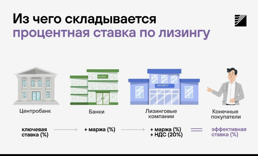 Лизинговые компании занимают деньги у банков. Они относятся к крупным заемщикам, для них деньги стоят порядка 18%. Без НДС, так как банковская деятельность не облагается налогом. Затем лизинговые добавляют свою маржу — в районе 2% и больше. Потом прибавляют НДС, так как лизинговая деятельность облагается налогом.