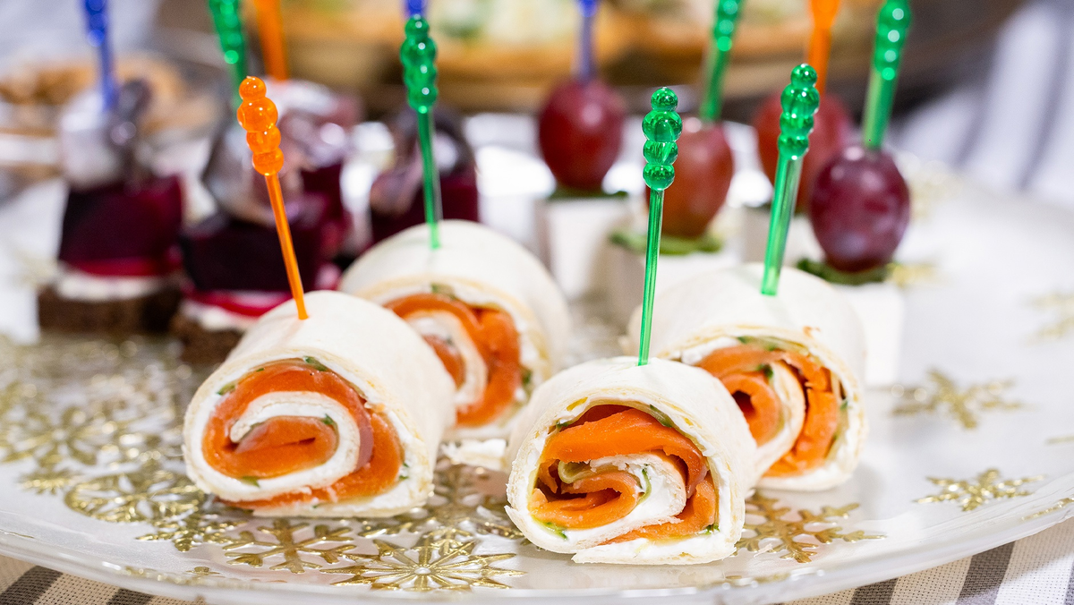 Готовим новогоднюю закуску на шпажке: канапе ролл с красной рыбой