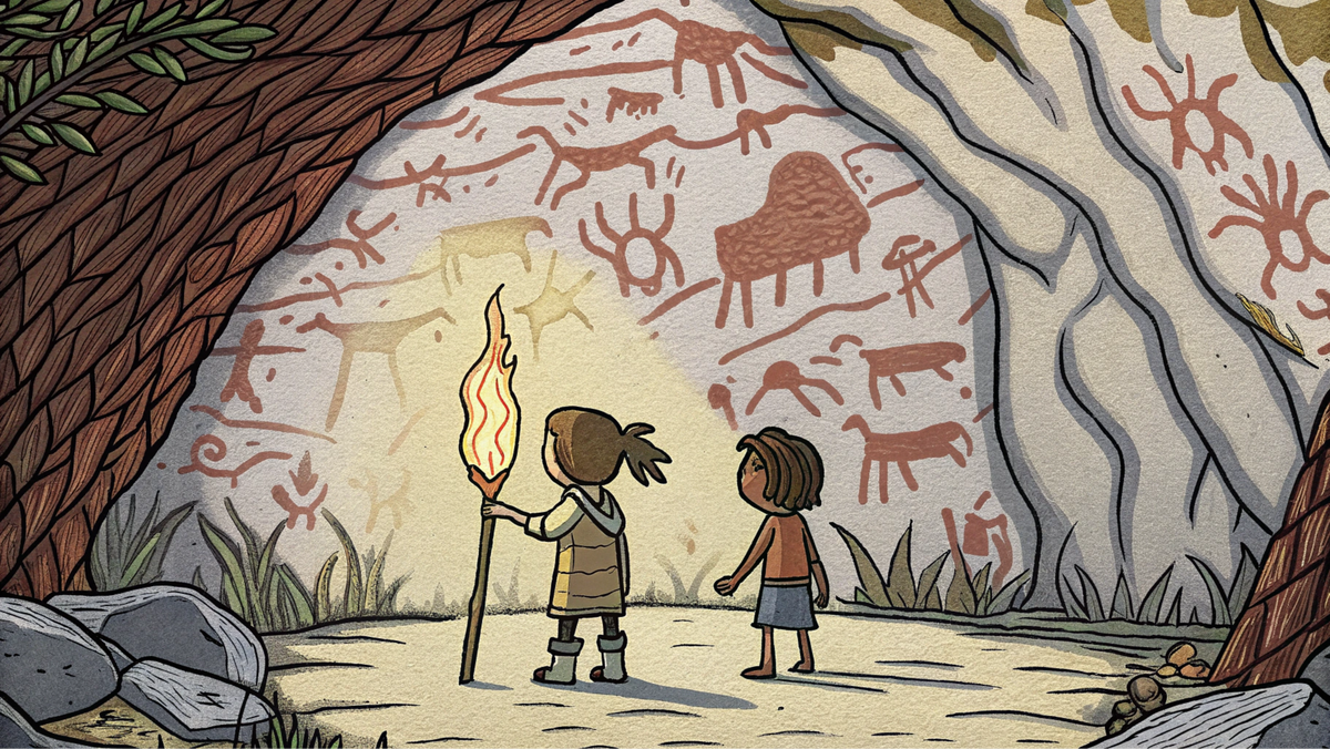 Повествование зародилось с визуальных историй, таких как наскальные рисунки, которые затем перешли в устные традиции, где истории передавались из поколения в поколение устно. Эти ранние нарративы служили для объяснения природных явлений, а барды разрабатывали пантеоны богов и мифов, чтобы осмыслить мир. Самые ранние сохранившиеся свидетельства такого визуального повествования можно найти в наскальных рисунках древних цивилизаций, например, в пещере Ласко во Франции, возраст которых превышает 17 000 лет.
