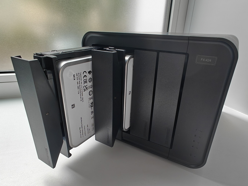 В зависимости от задач и доступного бюджета в F4-424 можно разместить накопители с общим объёмом до 88 ТБ или даже больше, если удастся найти и приобрести подходящие жёсткие диски. При использовании некоторых типов RAID-систем данные дублируются между разными накопителями, что сокращает доступный объём данных, но значительно повышает надёжность их хранения. Благодаря этому, NAS-систему можно использовать для бэкапа ценных данных или даже в качестве личного отказоустойчивого облака с доступом к файлам с любых устройств откуда угодно.