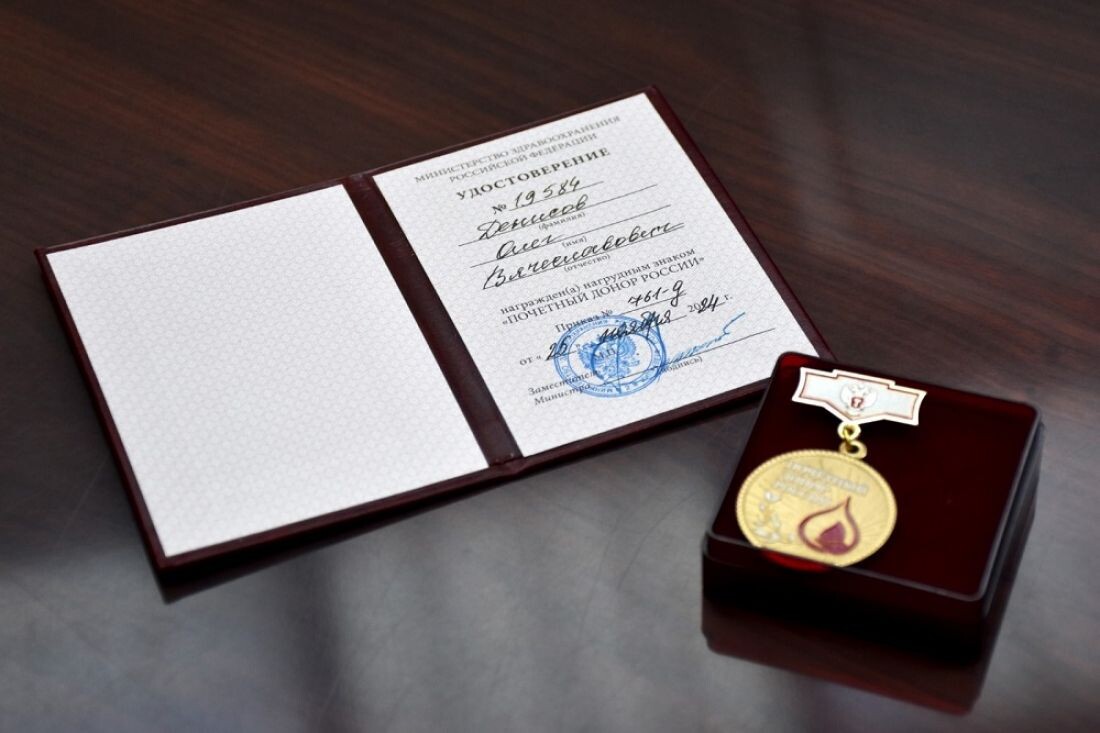 «Удостоен чести носить звание «Почетный донор России»! На декабрь 2024 сдал 36,6 литра крови, фляга», - рассказал Олег Денисов.
