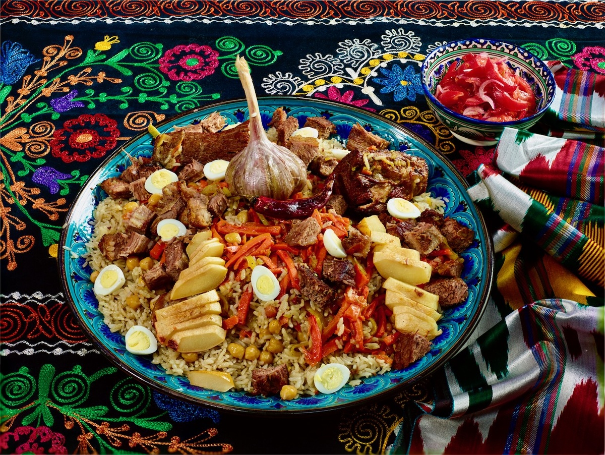 Самаркандский плов выкладывают слоями. Первый слой — рис. Затем горох и морковь. Рядом с блюдом должна быть доска и нож для нарезки мяса. Не переготавливайте мясо! Перепелинные яйца... ну, мы же с вами тоже немножко "модные чуваки"?