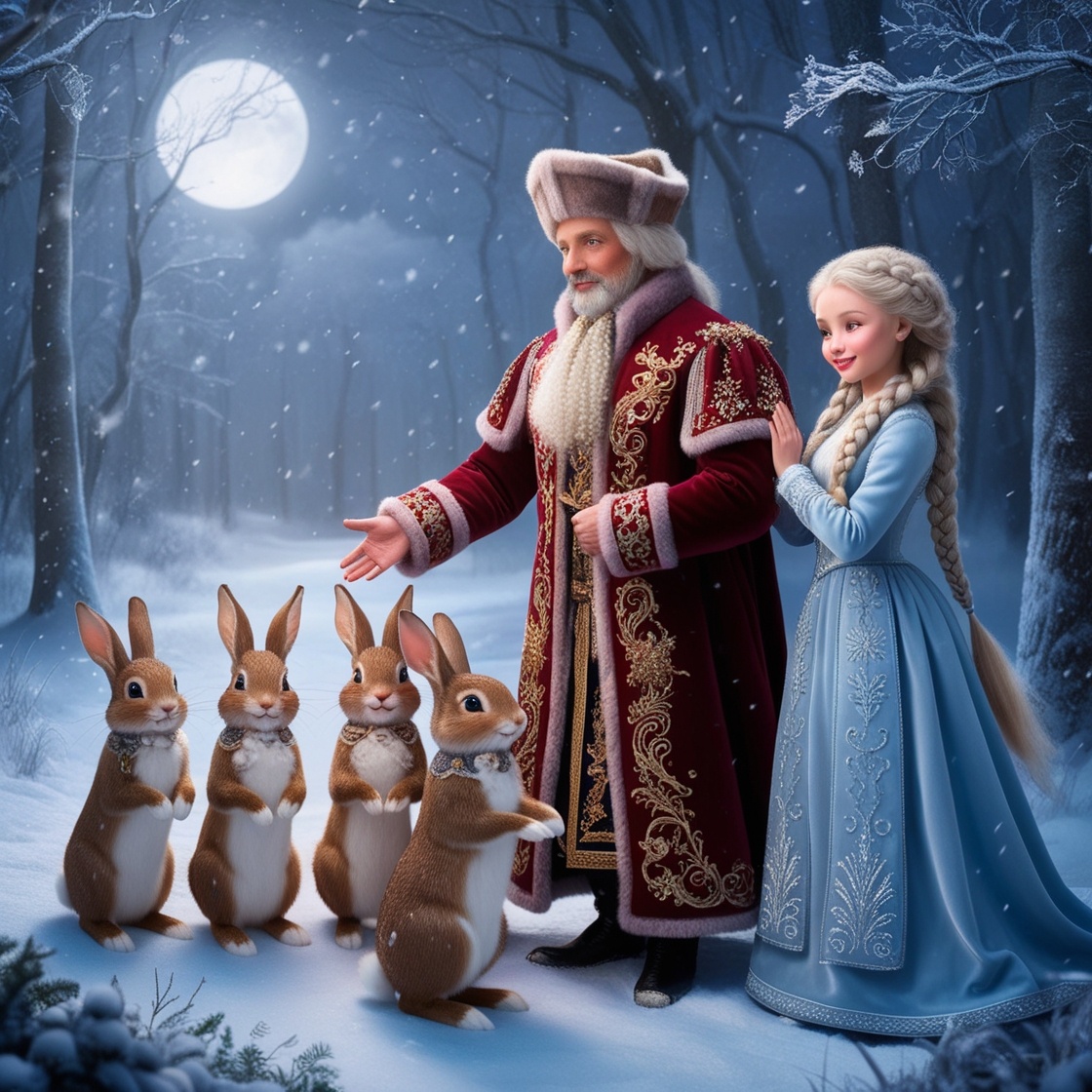 Однажды морозным утром позднего декабря, когда солнце только-только начало пробиваться сквозь заснеженные ветви, Кувырок проснулся от странного ощущения. В воздухе пахло чем-то необычным – морозной свежестью и... ожиданием чуда? «Что-то сегодня не так», – пробормотал он, потирая мягкой лапкой заспанные глаза. В этот момент в дверь его норки постучали. «Кувырок! Кувырок! Ты не поверишь, что я видела! – это была взволнованная Снежинка. Её длинные ушки подрагивали от возбуждения. – В лесу появились какие-то странные существа! Один большой, в красной шубе, с белой бородой, а рядом с ним девушка в серебристом наряде!» Прыгунчик и Пушинка, услышав шум, тоже выскочили из своих норок. «Может, спросим у Старого дуба? – предложила Пушинка, нервно приглаживая свою пушистую шёрстку. – Он же всё-всё знает!» Кролики поспешили к Старому дубу. По пути они встретили мудрую Сову, которая, как обычно, делала вид, что дремлет. «Хм-хм, – открыла она один глаз, – вы разве не знаете, какой сегодня день? Кан