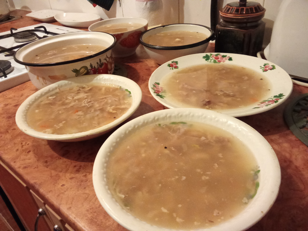 Муж извлек половину мясного набора из кастрюли. Куда столько мяса???? Набор для холодца в этот раз примитивный и очень бюджетный. Всего половина куриной тушки и голень индейки Шесть часов варила и потом, разобрав на косточки и мясо, добавила пакет желатина Родственница моя желатин не добавила в холодец и потом пришлось все переделывать... Желатин добавляю всегда, какой бы набор для студня у меня не был... Разлила по тарелкам и получилось достаточно много В прошлом году холодец варила со свининой и жира было с избытком - тоже не здорово... А вы, друзья, холодец, варили? Всех с Новым годом!