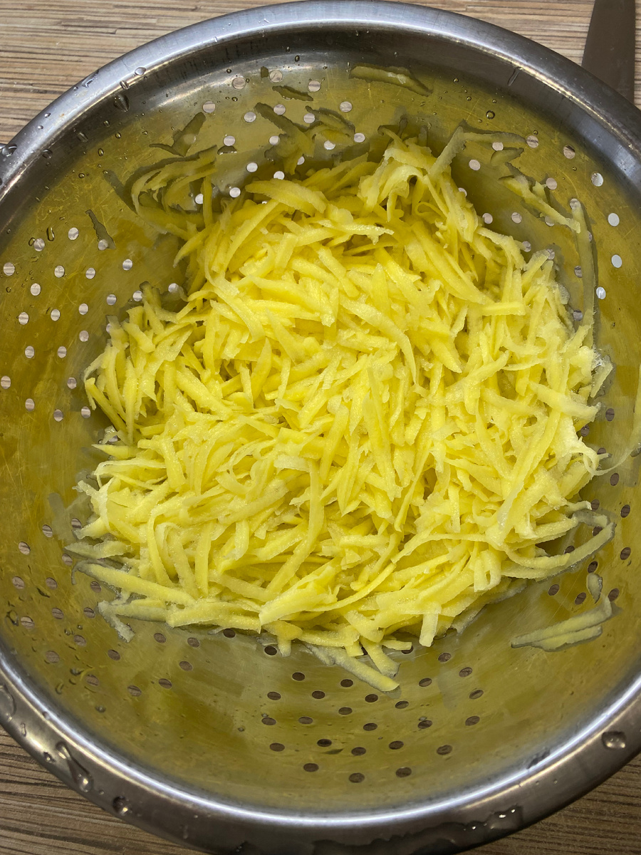 3 картошки промыть, очистить от кожуры, промыть водой, натереть на крупной терке Промыть холодной водой, залить натертую картошку холодной воды Разогреть сковороду с растительным маслом Взять небольшое количество натертого картофеля и обсушить бумажным полотенцем Выложить на сковородку жариться на маленьком огне Обжаренный картофель выложить на бумажное полотенце (чтобы впиталось лишнее масло), посолить Так, небольшими порциями обжарить всю натертую картошку - вот столько получилось Оставить обжаренную картошку и нужна она а самом конце, прямо перед подачей. Отварить куриное филе грамм 500 Филе нарезать на кусочки Яйца куриные 4 штуки промыть водой, залить водой и варить после закипания 15 минут. Слить горячую воду, залить холодной водой, остудить, очистить от скорлупы, натереть на крупной терке Один свежий огурец промыть водой Огурец натереть на крупной терке Все смешать (куриное филе, яйца и огурец), посолить, добавить 1 столовую ложку майонеза, перемешать. Натереть на крупно