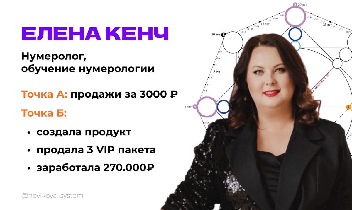 Хочу вас вдохновить результатами ученицы Азбуки Запуска, нумеролога Елены Кенч 📍 Точка А: до прихода на курс у Лены были охваты до 120 человек и доход около 70 000 рублей в месяц. Большинство клиентов приходили по сарафанному радио, курсы запускались редко, а групп было по 3-4 человека. Продукты стоили по 3000 рублей. Она мечтала о большем: о путешествиях, подарках для себя и уверенности в продажах. Но останавливали страхи: «Что, если не получится?», «Что, если всё пойдёт не так?», «А вдруг это дорого, и никто не купит?». ➡️ На курсе мы выстроили структуру её блога, провели исследование целевой аудитории, упаковали продукт, прописали прогрев и отработали возражения. 📍 И вот что получилось: 1. Лена собрала новый продукт, в 30 раз дороже её привычного чека — 90 000 рублей.