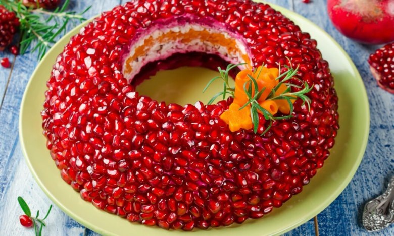Покорившее сердца многих благодаря яркому внешнему виду и гармоничному сочетанию вкусов. Его красочный дизайн, напоминающий драгоценный браслет, украшенный гранатовыми рубинами, делает его желанным гостем на любом торжественном столе, особенно в период новогодних и рождественских праздников.