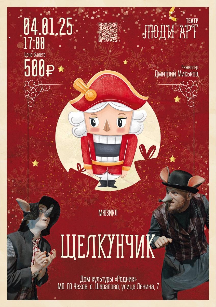 💥 Дорогие друзья и любители театрального искусства! С радостью приглашаем Вас в ДК "Родник" ГО Чехов на всеми любимый мюзикл “Щелкунчик” в исполнении талантливых актеров театра ЛюДи АРТ! Эта волшебная история перенесет Вас в мир чудес и захватывающих приключений. На сцене оживет мир игрушек, где Щелкунчик, заколдованный принц, сразится с Крысами ради спасения прекрасной Мари. Вас ждут яркие костюмы, завораживающая музыка и, конечно же, незабываемый сюжет, который тронет сердца зрителей всех возрастов. Ждем вас на спектакле “Щелкунчик”, который подарит вам незабываемые эмоции и атмосферу настоящего волшебства! 📶 Категория: Спектакли 🚫 Возраст: 6+ 📆 04.01.2025 🕕 17:00 🏢 ДК «Родник» 📍 г.о. Чехов, с. Шарапово, ул. Ленина, д.7 💰 Цена: 500 ₽ 🎫 Купить билет: https://iframeab-pre10064.intickets.ru/seance/47997242/#abiframe