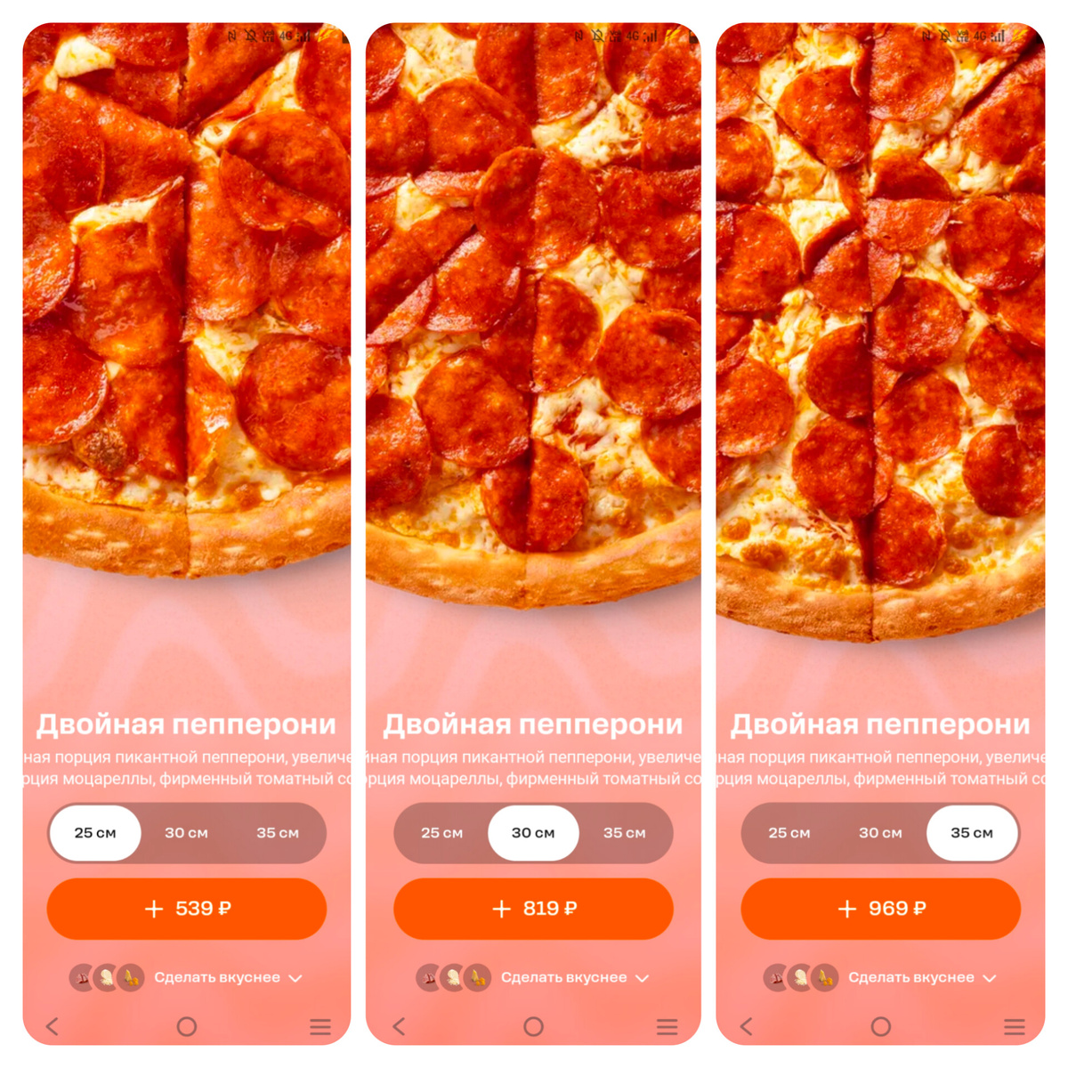 Смотрите, перед нами дилемма. Мы хотим как можно больше пиццы за как можно меньше денег. Можно заказать двойную пепперони диаметром 25 см за 539 рублей, 30 см за 819 руб либо 35 см за 969 рублей. Какое предложение вам кажется выгоднее? Жизненный опыт подсказывает, что чем больше порция, тем выгоднее получается. Но так ли это с пиццей? Будем считать стоимость одного квадратного сантиметра пиццы в каждом случае. Для этого нам нужно найти площадь каждой пиццы и потом поделить на неё стоимость. Пиццы круглые, так что берём формулу площади круга и считаем: πR², не забывая при этом, что радиус — это половина диаметра. πR² = 3,14 • (25/2)² = 490,625 см² Теперь делим стоимость пиццы на площадь: 539 рублей : 490,625 см² ≈ 1,1 руб/см², то есть около 1 рубля и 10 копеек за квадратный сантиметр пиццы. Много это или мало пока непонятно, так что считаем дальше. πR² = 3,14 • (30/2)² = 706,5 см². Теперь находим удельную стоимость: 819 : 706,5 ≈ 1,16. Неожиданно, но средняя пицца стоит дороже маленько