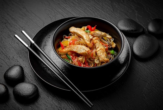 Диетическое блюдо из филе бедра курицы и фунчозы получается легким, но в то же время сытным и полезным. При этом оно не вредит фигуре — всего 150 ккал на 100 г.