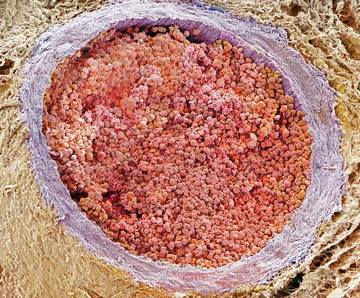 На снимке хорошо видно как саму стенку артерии, так и множество кровяных клеток (эритроцитов), заполняющих её внутреннее пространство.