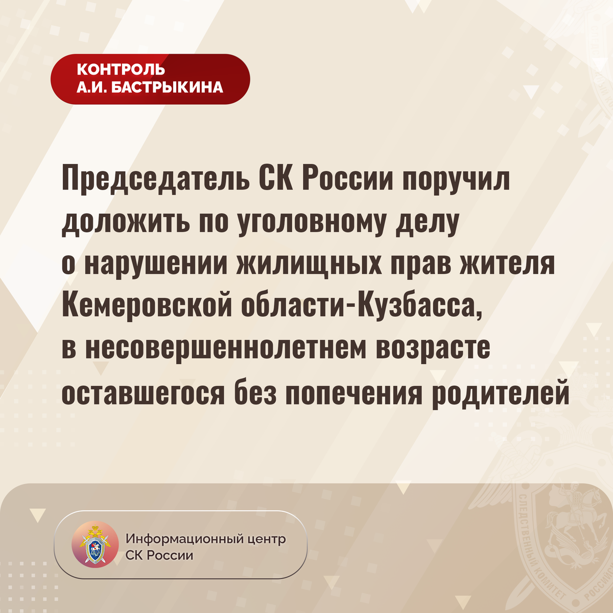 Председатель СК России поручил доложить по уголовному делу о нарушении жилищных прав жителя Кемеровской области-Кузбасса, в несовершеннолетнем возрасте оставшегося без попечения родителей К Председателю СК России А.И. Бастрыкину в его приёмную «ВКонтакте» обратился житель Кемеровской области-Кузбасса, в несовершеннолетнем возрасте оставшийся без попечения родителей, по вопросу непредоставления ему положенного по закону жилья. С 2013 года заявитель состоит на учете лиц, подлежащих обеспечению жилыми помещениями, однако мер к реализации его прав не принимается, срок выдачи жилплощади постоянно переносится. Многочисленные обращения в профильные структуры результатов не принесли. Ранее А.И. Бастрыкин ставил указанную ситуацию на контроль в центральном аппарате ведомства. В СУ СК России по Кемеровской области - Кузбассу по поступившему обращению возбуждено уголовное дело. Председатель Следственного комитета Российской Федерации Александр Иванович Бастрыкин поручил руководителю СУ СК России