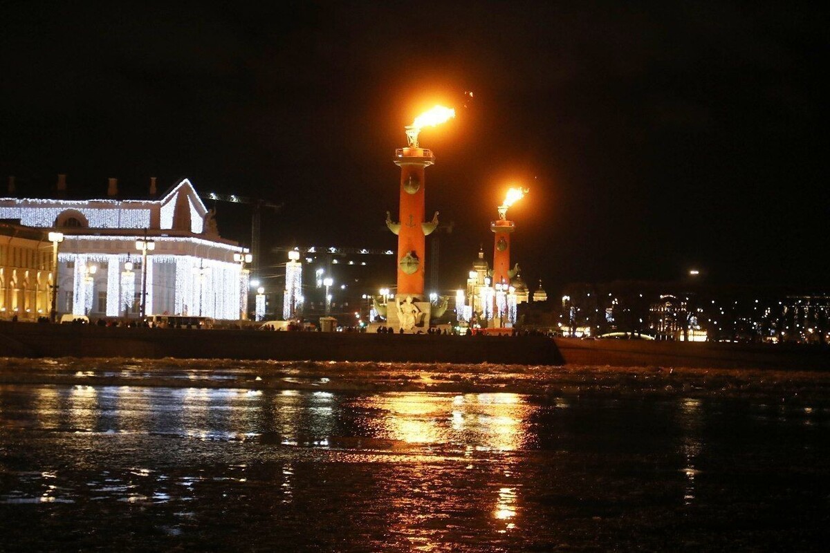 Факелы Ростральных колонн зажглись в честь наступления Нового года