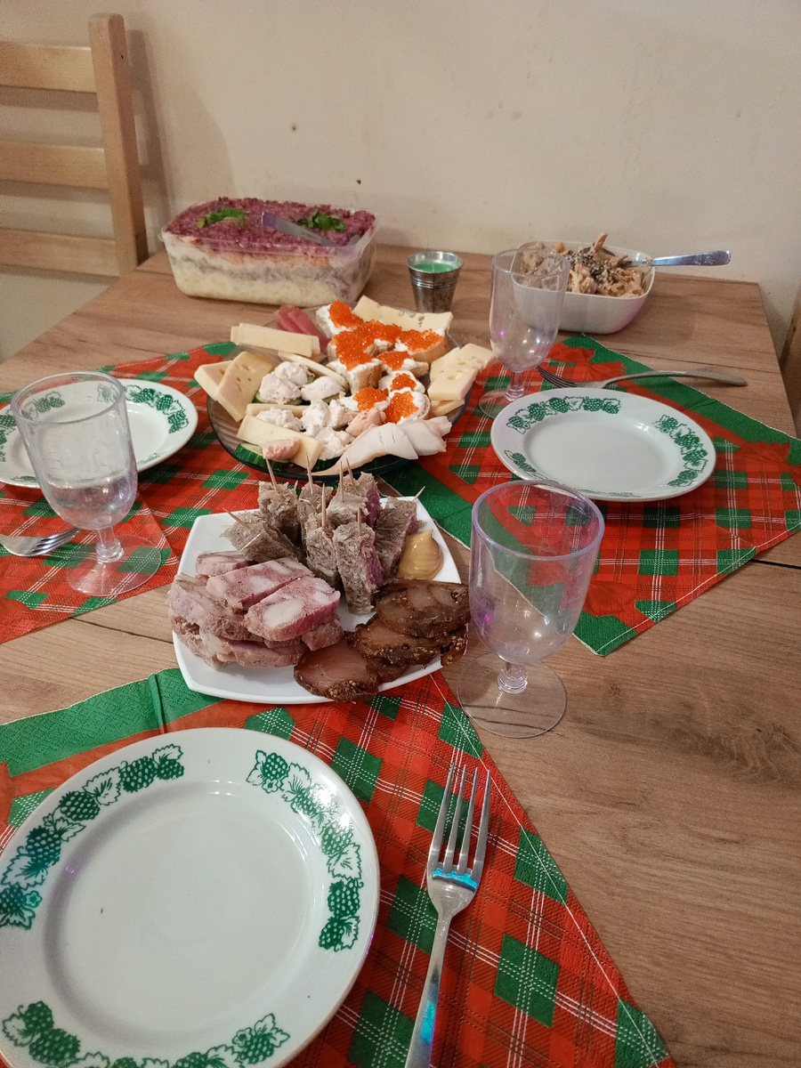 А деликатесов на старое хватило. Кроме мясного и сыра, закуску приготовила каждому по одной штучке.