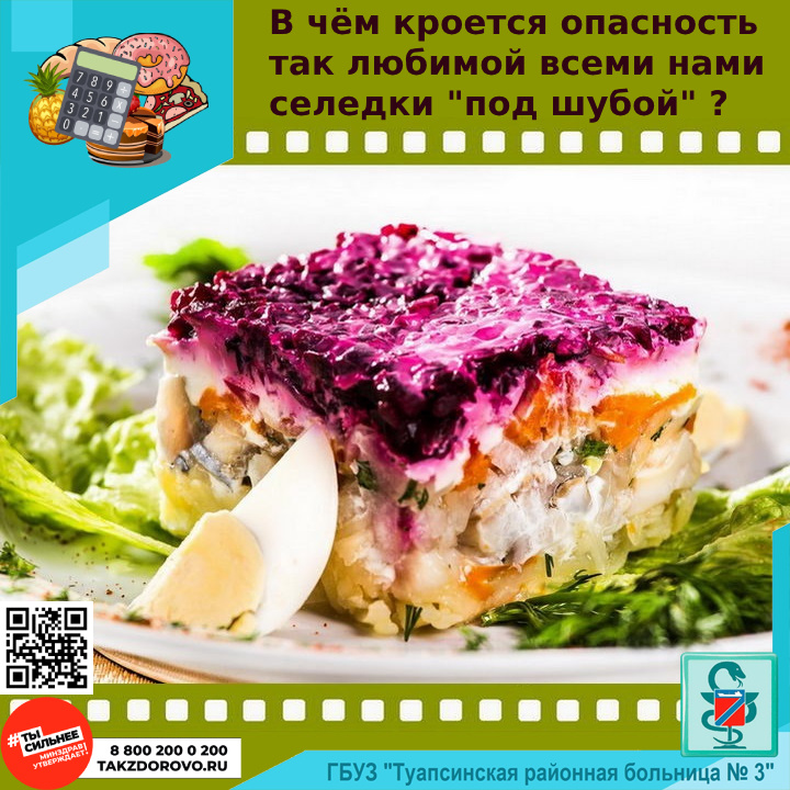 Диетологи каждый год перед праздниками призывают не увлекаться закусками новогоднего стола. "Селедку под шубой" делает вредной не только майонезная заправка. Слабосоленая сельдь, обилие простых углеводов - весьма небезопасное сочетание, ведь селедка - это жир, белок и много соли, яйца - это животный белок, майонез - это много соли, много жира, дополнительные углеводы. А всё вместе это представляет для организма опасную смесь. Казалось бы, что в этом салате так много овощей, но и свекла, и морковь, и картошка - это все простые углеводы, с высоким гликемическим индексом. Поэтому людям с сахарным диабетом, инсулинорезистентностью, высоким давлением, риском атеросклероза и сердечными недугами лучше с такими закусками не экспериментировать. Врачи призывают не провоцировать у себя скачки сахара, не провоцировать срыв систем организма, отвечающих за углеводный обмен, и отказаться от таких блюд в сторону более полезных. #укреплениеобщественногоздоровья