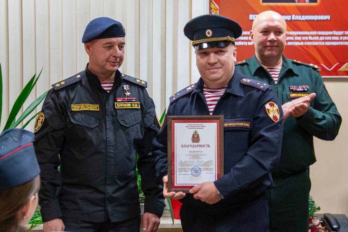 Росгвардейцев, заступивших в новогоднюю ночь на службу по обеспечению безопасности петербуржцев и гостей города, поздравил командующий Северо-Западным округом войск национальной гвардии РФ Герой России генерал-лейтенант Сергей Бураков. Вместе с начальником Главного управления Росгвардии по г.Санкт-Петербургу и Ленинградской области генерал-лейтенантом Андреем Тарасовым командующий округом посетил спецподразделения ОМОН «Бастион», ОМОН (на транспорте) «Балтика» и СОБР «Гранит», а также батальон вневедомственной охраны, обеспечивающий безопасность Государственного Эрмитажа. Генерал-лейтенант Сергей Бураков проверил готовность росгвардейцев к несению службы, вручил погоны к очередным званиям и грамоты отличившимся сотрудникам, а также поздравил личный состав с наступающим Новым годом. Также с праздником поздравили росгвардейцев, в том числе участников специальной военной операции, находящихся на излечении в военных госпиталях