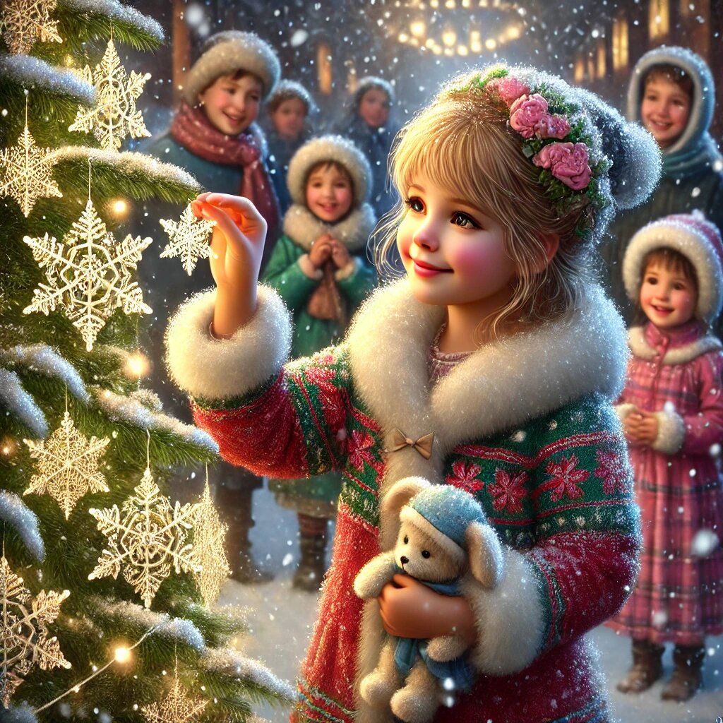 В одном небольшом городке жила девочка Катя. Она умела красиво рисовать и делать поделки, но думала, что её работы недостаточно хороши. Она боялась показать свои рисунки другим детям и стеснялась заговорить с ними. Ей казалось, что она не сможет найти друзей, и она часто оставалась одна. Каждый Новый Год Катя загадывала одно и то же желание: обрести друзей. Но ничего не менялось, и девочка начала терять надежду. В канун праздника она сидела одна в комнате, грустно глядя на пустой лист бумаги. Шуршик, заметив её печаль, решил помочь. Он пробрался в её комнату и оставил записку: "Привет, Катя! Я гном Шуршик. Я знаю, что ты стесняешься, но у тебя есть особый дар — твои рисунки могут делать людей счастливыми. Попробуй сделать украшение для ёлки. Пусть все увидят, какая ты талантливая." Катя сначала не поверила своим глазам, но что-то в этих словах заставило её улыбнуться, и она решила попробовать. Она достала из коробки с материалами плотный картон и принялась старательно вырезать снежинки