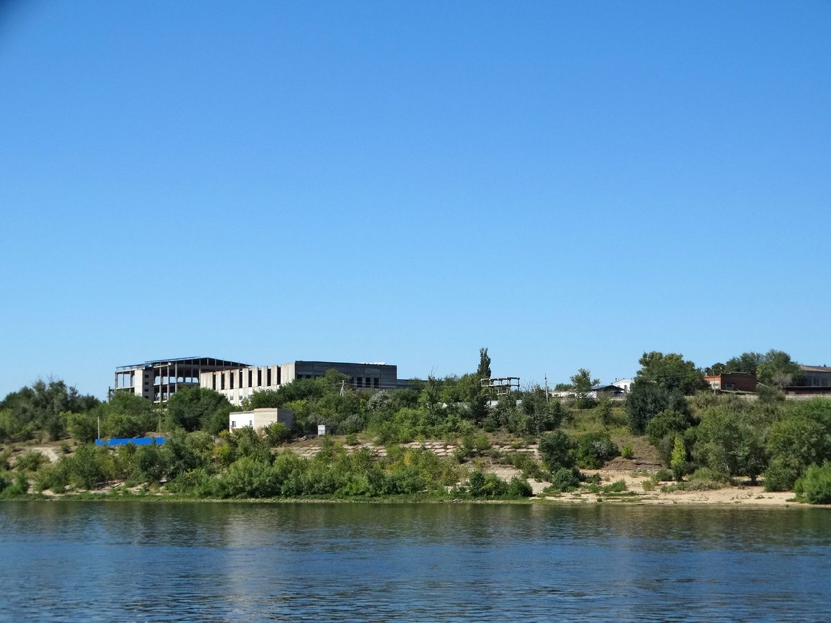 Как и в северной части города, здесь вдоль Волги тоже стоят различные предприятия, которые часто выглядят не лучшим образом. Это вообще типично для Волгограда, который не смотря на славу промышленного города, промышленностью не особо изобилует. Нет, конечно, производства есть и довольно крупные, но в то же время увидеть руины какого-нибудь завода у нас нетрудно. Вот и в тот августовский день, едва наш теплоход прошёл мимо ТРЦ "Акварель", на берегу мы заметили какие-то цеха, явно нерабочие. Находятся они на улице имени Евгения Рогова сразу за перекрёстком с улицей имени Степыкиной. Потом уже глянул по карте, это было самое начало Кировского района. Там промзона. Какие-то помещения, судя по снимкам со спутника, вполне себе рабочие, а какие-то выглядят так, как на фото.