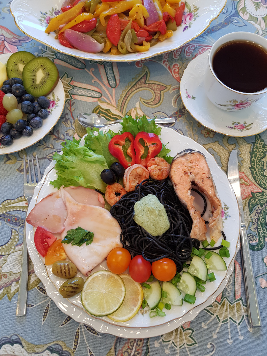 Добрый день, дорогие друзья! Сегодня я предлагаю вашему вниманию очень простые, но эффектные праздничные гарниры, которыми вы сможете удивить и порадовать близких, родных и друзей. Для приготовления перцев нам понадобятся: 9 цветных перцев, 1 фиолетовая луковица, 1 столовая ложка приправы итальянские, 1/2 столовой ложки соли, 2 столовые ложки оливкового масла. Для приготовления макарон нам понадобятся: 500 грамм макарон с чернилами каракатицы, 2 чайные ложки соли, 2 столовые ложки сливочного масла. Приготовление: перец нарезать крупными полосками, луковицу разрезать на 8 частей. Полить овощи оливковым маслом, посыпать приправой, посолить, перемешать. Запекать в духовом шкафу на режиме «Гриль» при температуре 200 градусов Цельсия в течение 30 минут, перемешивая через каждые 10 минут. В 4 литра кипящей соленой воды опустить макароны, варить 9 минут, слить воду, добавить сливочное масло, перемешать. Отлично подходит к макаронам из каракатицы кокосовый соус. Запеченный перец с луком и мак