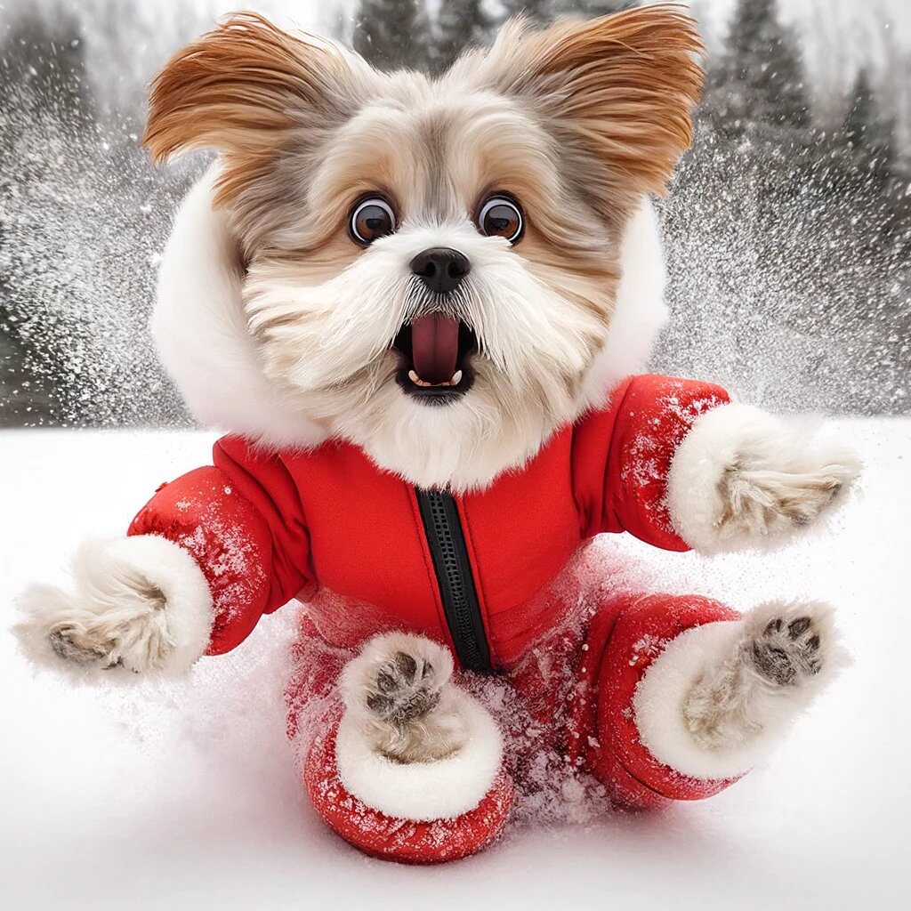 Привет, друзья! С вами Пончик, мастер находить приключения даже там, где их нет. Сегодня я расскажу вам, как этот мир снова решил меня удивить. И виноват в этом... снег! Вы, наверное, думаете: «Пончик, ты уже взрослая, видела снег и знаешь, что к чему?» Ну да, видела. Но каждый год он приходит внезапно и ведёт себя так, будто он тут главный. Холодный, липкий и везде суёт свой белый нос! Вчера всё было нормально: кустики, травка, крошки на асфальте. А сегодня… БАЦ! Всё белое и холодное. «Опять этот снег...» — вздохнула я, свернулась клубком и решила, что мой день на этом закончен. Но мои люди решили иначе. «Ооо, первый снег!» — радостно закричали они, будто это повод для праздника. И тут началась моя личная трагедия. Они достали комбинезон, тот самый, где мои лапы забывают, как ходить. Надели его на меня, игнорируя мои возмущённые взгляды, и потащили на улицу. Это было явно нарушением моих собачьих прав! Первый шаг в снег, и сразу: «ОЙ!». Лапы проваливаются, хвост прячется, а я стою и