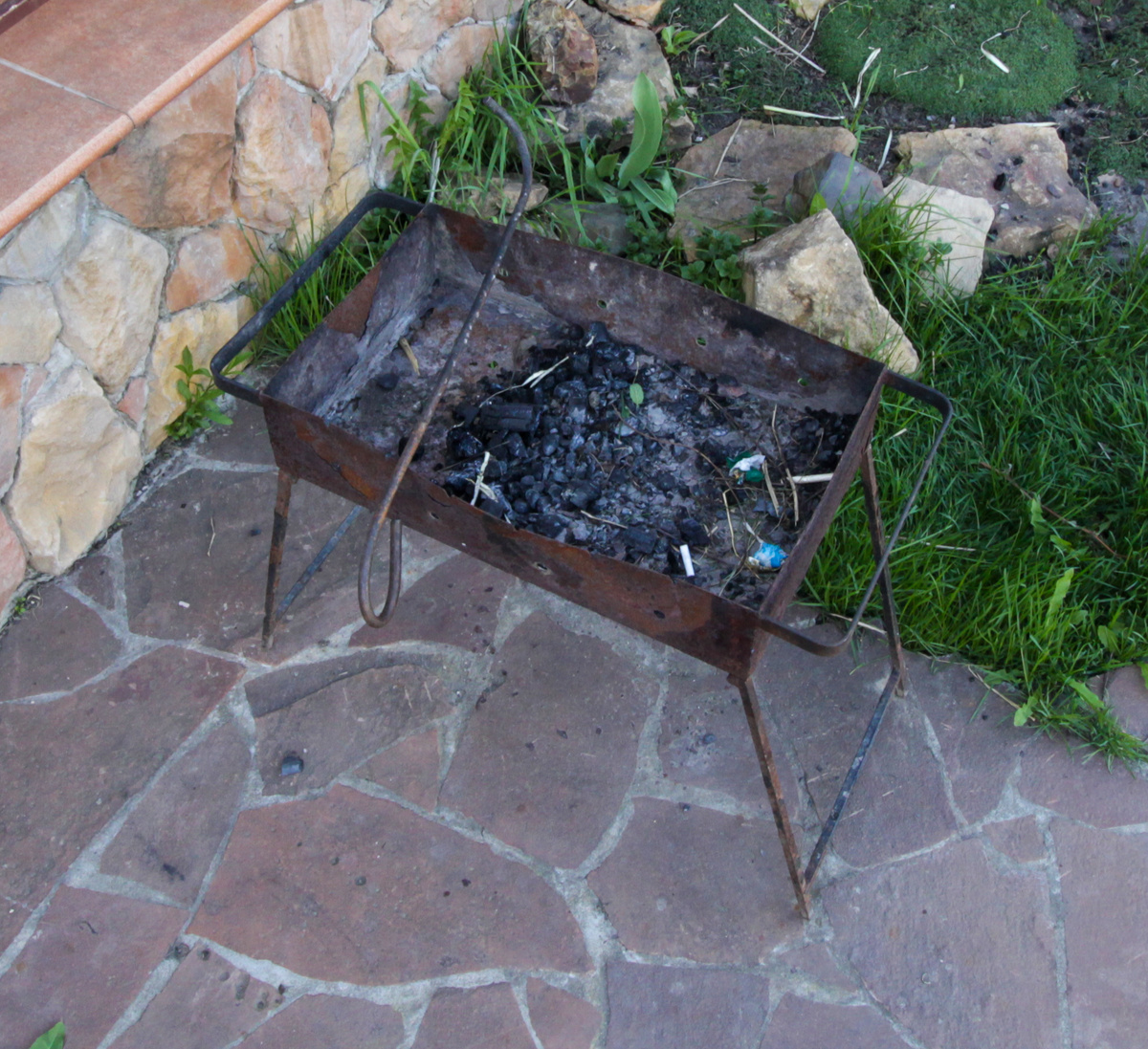Замечаю иногда даже в дорогих домах, где, казалось бы, есть всё, шашлык жарится на таком низком мангале, который стоит на наклонной отмостке у дома…