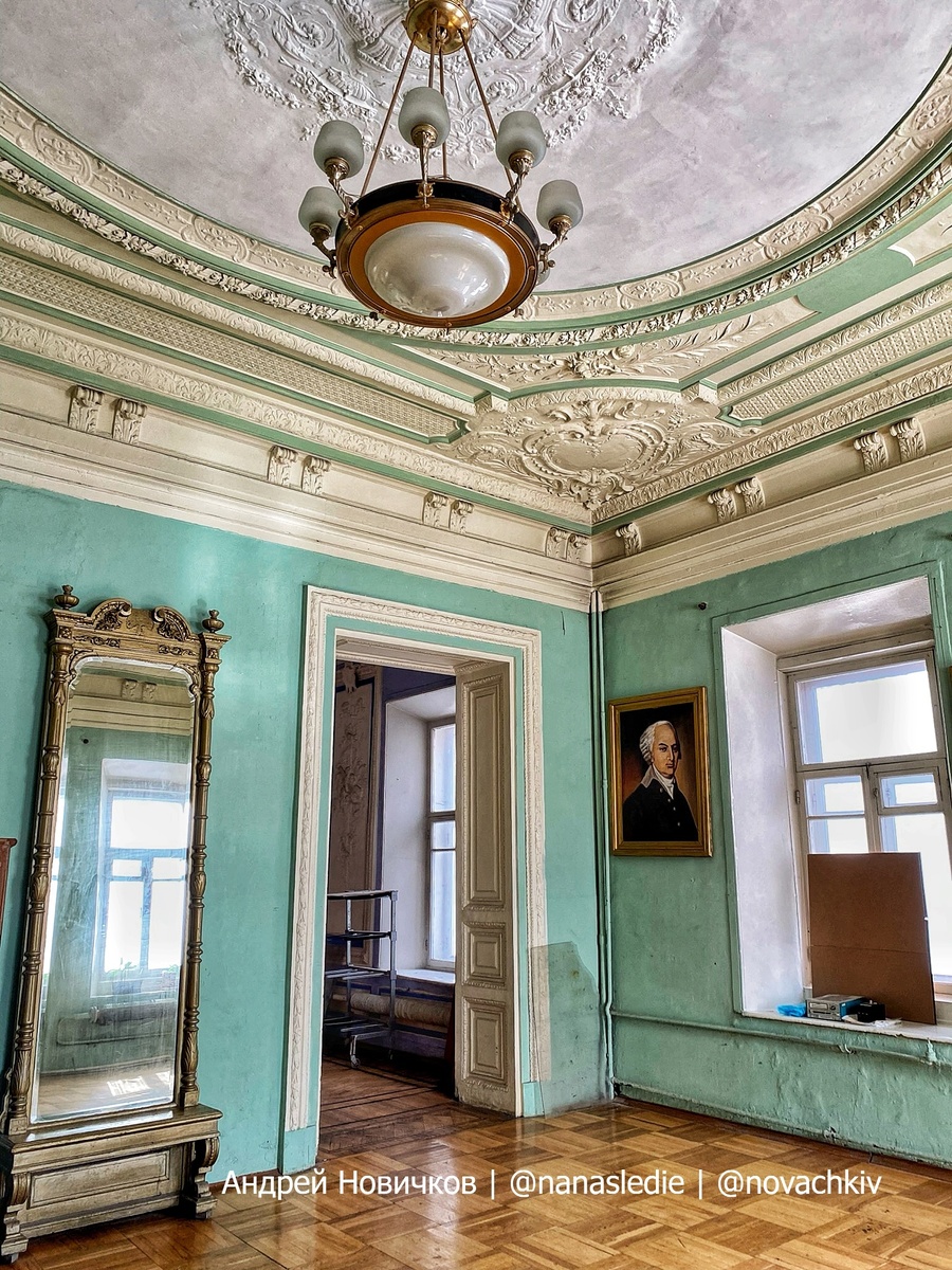 Сегодня здание поражает своими интерьерами: парадные комнаты с лепным декором, паркетом и изразцовыми печами, а также «Музыкальная гостиная» с рельефами музыкальных инструментов. Несмотря на запустение, в дворце сохранились старинные книжные шкафы, зеркала и люстры.