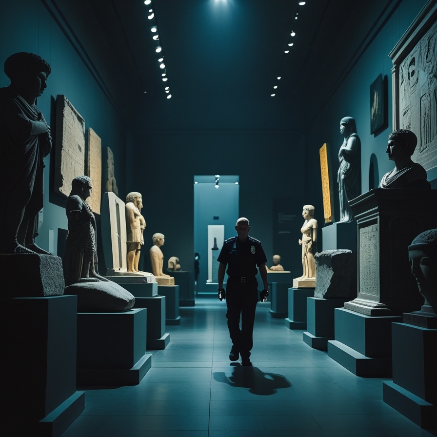Я схватил фонарик и пошёл проверить. Холл был пуст. Только статуи, стоящие вдоль стен, и витрины с древними артефактами, освещённые тусклыми лампами. Но звук шагов продолжался. Он раздавался из зала с греческой коллекцией.