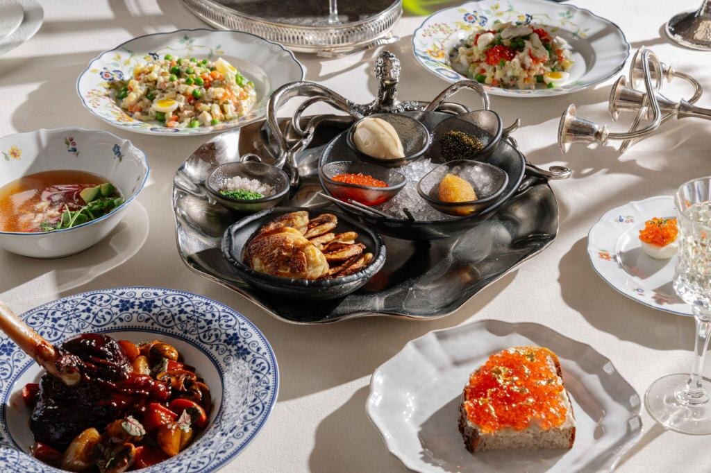 До конца январских праздников в новогоднем меню: оливье с лососем (680), хе из морского окуня (350), семга под шубой (490), холодец фо бо (400), курица в апельсиновом соусе (540) и другие блюда.