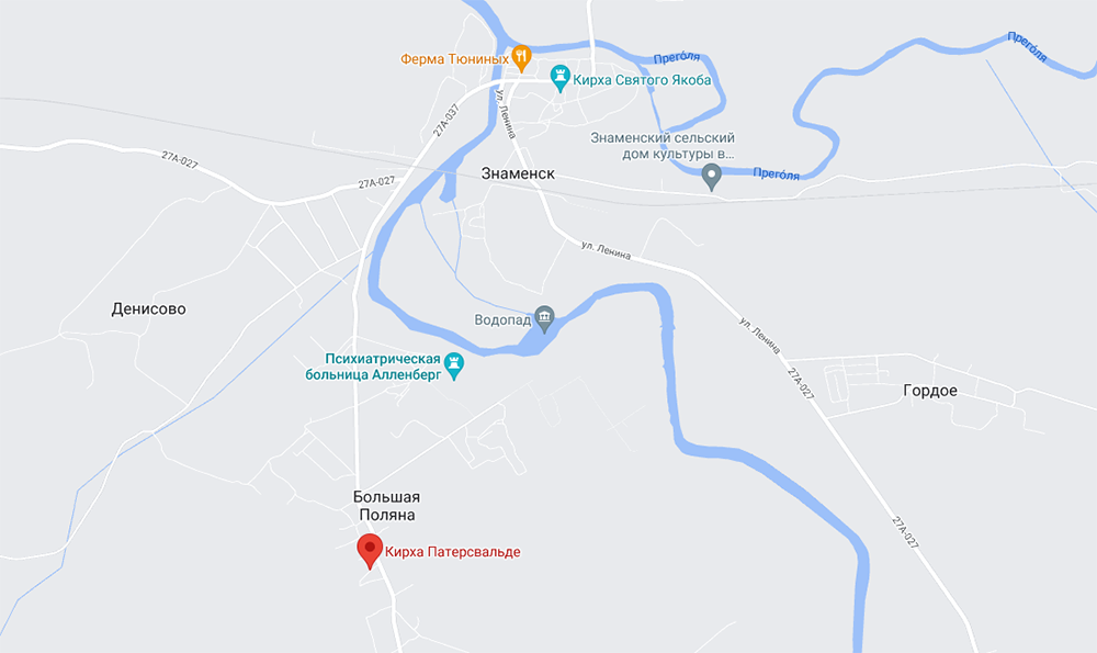 Посёлок Большая Поляна, в котором проживает менее трёхсот человек, находится в нескольких километрах южнее Знаменска и входит в состав одноимённого сельского поселения, но стратегической связи со своим «старшим братом» не имеет. У его восточно-прусского предшественника история была кардинально другой: Аллендорф-Патерсвальде являлся важным пригородом Велау (совр. Знаменск) - служил южным форпостом любимого города герцога Альбрехта, однажды защитив его от нападения поляков. Для путешественника же в этом ныне крошечном населённом пункте сохранилось сразу два ценных исторических памятника.