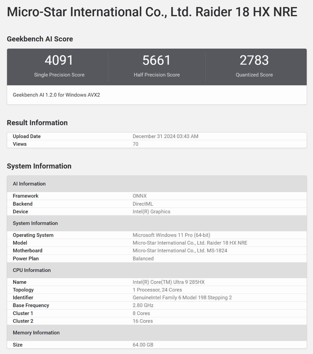 В базе данных Geekbench впервые появились результаты тестирования процессора Intel Core Ultra 9 285HX и первого ноутбука на его основе MSI Raider 18 HX, сообщает VideoCardz. Отчёт подтверждает, что рассматриваемый процессор является 24-ядерным. По сути, это настольный Core Ultra 9 285K в корпусе BGA для ноутбуков, как и другие представители класса HX, выпущенные в прошлых поколениях. Процессор сочетает 8 производительных ядер и 16 эффективных, поддержки технологии Hyper-Threading (HT) в семействе Arrow Lake нет, поэтому потоков столько же, сколько ядер. Базовая частота процессора составляет 2,8 гигагерц (ГГц) при базовой мощности 55 ватт (Вт), информация о пиковой частоте в отчёте Geekbench отсутствует, зато есть сведения о видеокарте. Источник изображения: Geekbench, VideoCardz На удивление, Geekbench сообщает о наличии в составе ноутбука дискретной видеокарты NVIDIA GeForce RTX 4070, что довольно странно, учитывая слухи о презентации всей линейки видеокарт RTX 50 для ноутбуков 6 янва