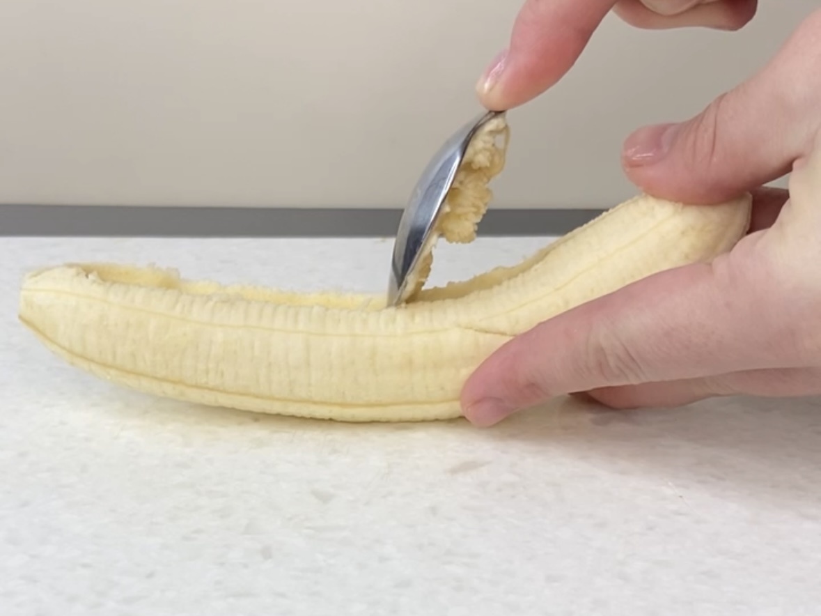 Возьмите банан. Маленькой ложкой аккаурано сделайте небольшое углубление вдоль банана, частично удалив мякоть.
