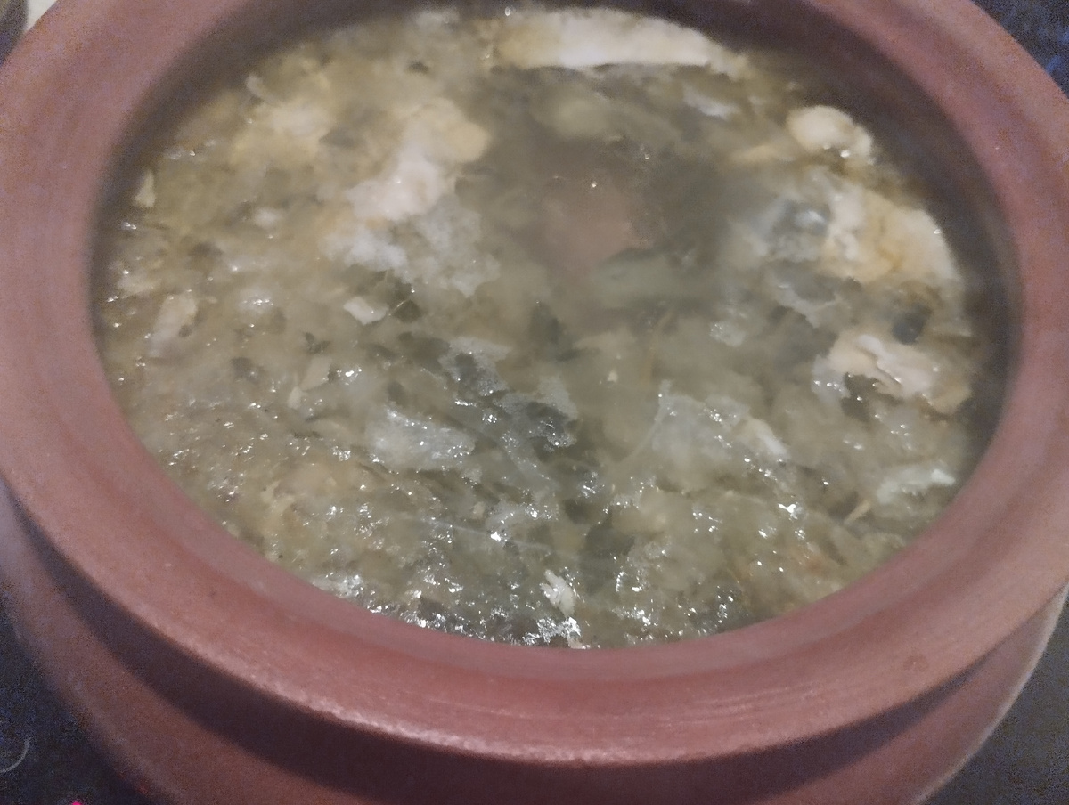 Сначала положила в воду хребет от курицы, луковицу, перец горошком, стебли от укропа и лавровый лист. Все это с вечера томилось на печке. С утра я бульон процедила, мясо отделила от косточек, укроп, лук и перец выкинула. В густой отвар положила крошево ( зелёную квашеную капусту) и обычную белую квашеную капусту. Все это томилось на печи ещё часа 2-3 в толстом глиняном горшке. Более я в щи из крошева ничего не добавляю, ни картошки, ни лука, ни моркови - ничего. Щи и так получаются густыми и очень вкусными. Сюда можно добавлять тертый соленый огурец и огуречный рассол, это будет кстати.