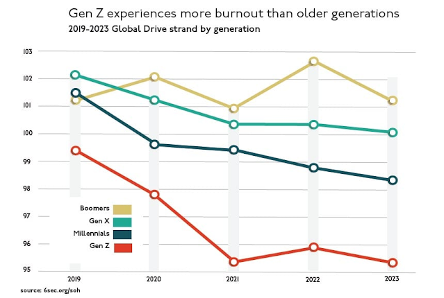 Конечно, не все расстроены, но исследования показывают, что молодым людям это тяжело. Исследование показало, что способность поколения Z ориентироваться в эмоциональном диапазоне снизилась на 16% за последние четыре года. Эта способность, «сохранять чувство цели в мире перемен», отражает чувство беспокойства среди наших молодых сотрудников.