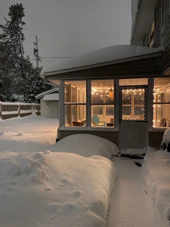 Зажгли гирлянды и любовались, как они переливаются разными огоньками в темноте. Сверху посыпался на наши головы легкий мелкий снежок.